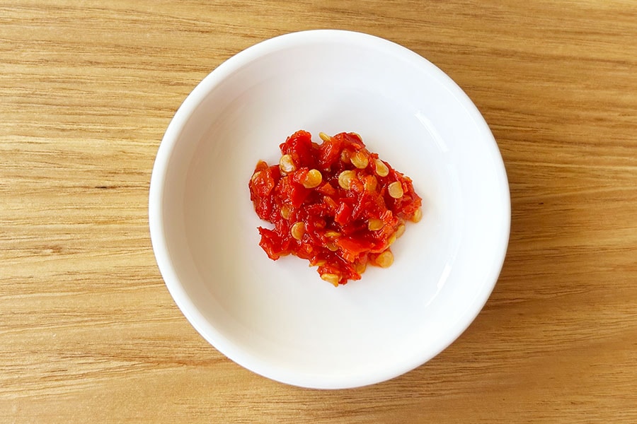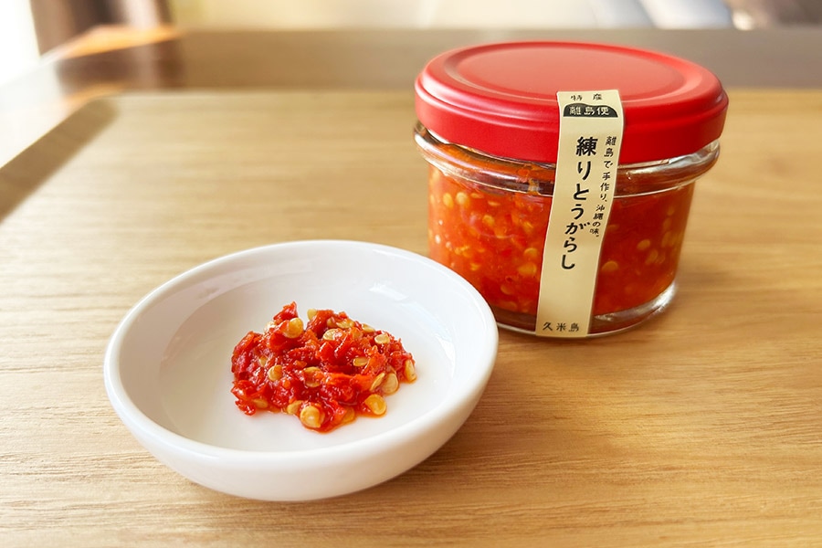島唐辛子を含む、久米島産の唐辛子をすりつぶしてペースト状にした辛味調味料。
